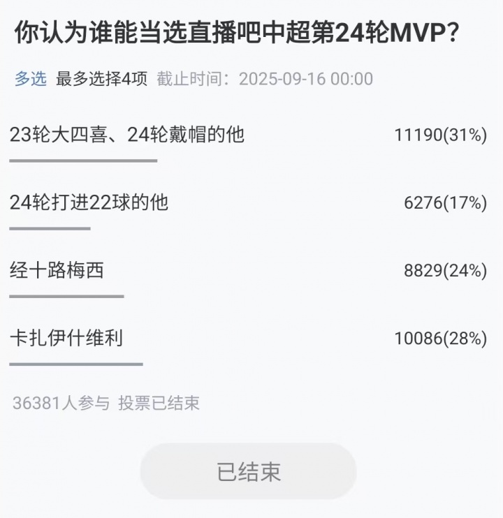 23轮大四喜、24轮戴帽的他——吧友投票率30.76%