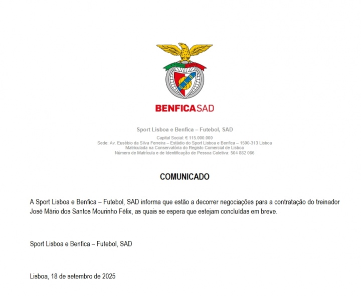 本菲卡体育足球股份有限公司已经向葡萄牙证券市场委员会通报,有关穆里尼奥教练的任命谈判正在进行中,预计即将完成签约。